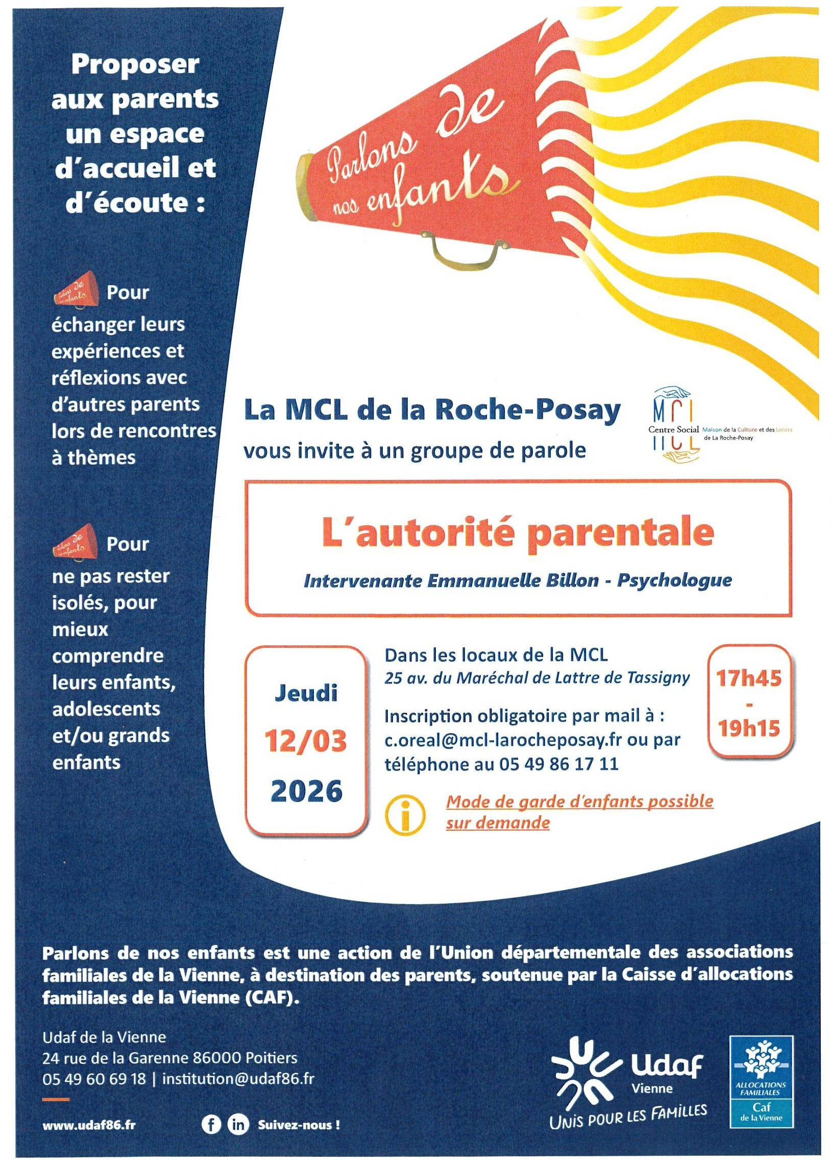 Parlons de nos enfants + Ajouter à mon Agenda Google + iCal / Outlook export 00 jours 00 heures 00 minutes 00 secondes Date Mar 12 2026 Heure 17h45 - 19h15 Lieu MCL 25 Av de Lattre de Tassigny Partagez cet événement