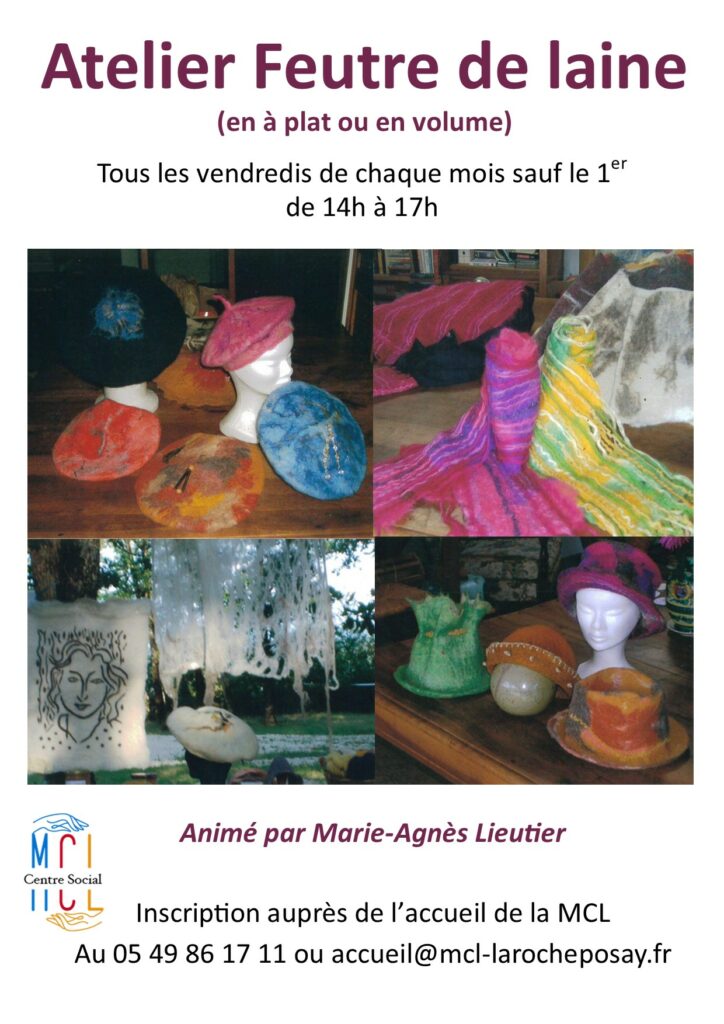 Atelier feutre de laine + Ajouter à mon Agenda Google + iCal / Outlook export 00 jours 00 heures 00 minutes 00 secondes Date Jan 16 2026 - Juin 30 2026 Heure 14h00 - 17h00 Lieu MCL 25 Av de Lattre de Tassigny Partagez cet événement