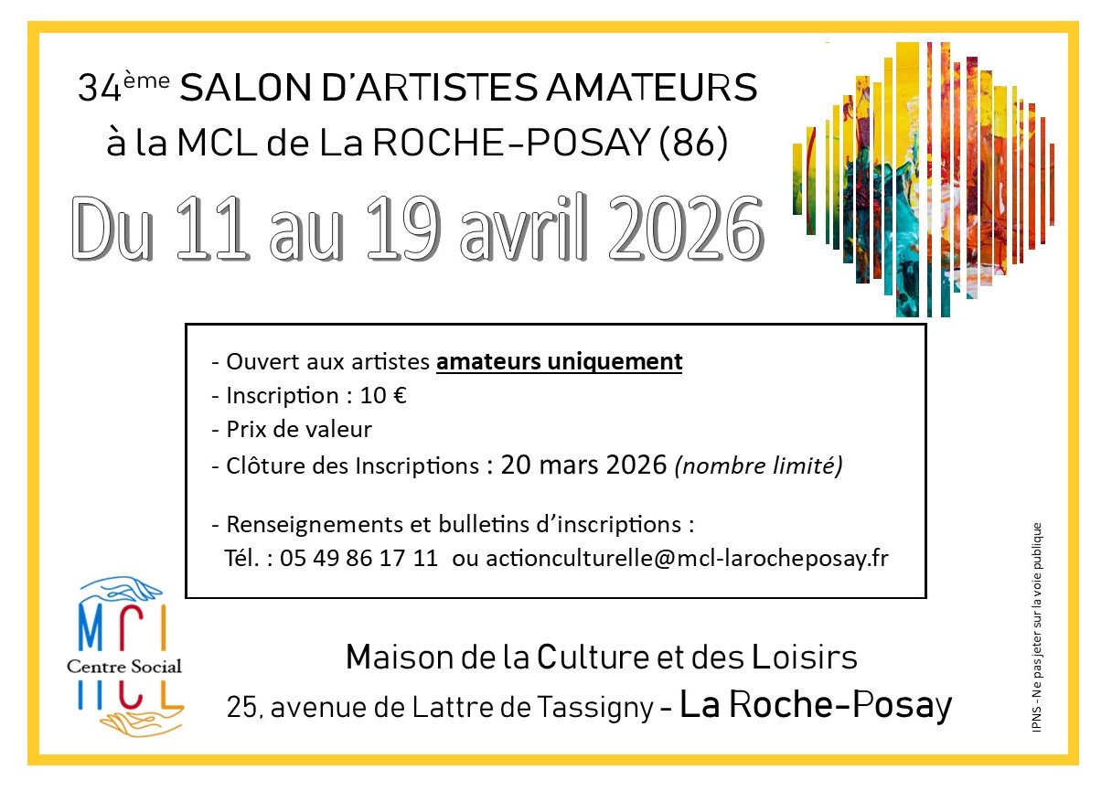 Inscription Salon d’Artistes Amateurs + Ajouter à mon Agenda Google + iCal / Outlook export L'événement est en cours. Date Jan 21 2026 - Mar 20 2026 Chargement... Heure 0h00 - 18h00 Lieu MCL 25 Av de Lattre de Tassigny Partagez cet événement