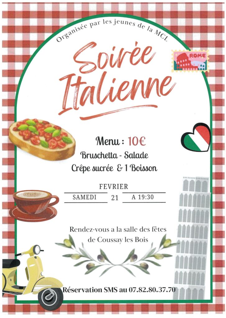 Soirée italienne + Ajouter à mon Agenda Google + iCal / Outlook export Date Fév 21 2026 Expiré! Heure 7h30 - 23h00 Lieu Salle des fêtes Coussay-les-Bois Partagez cet événement